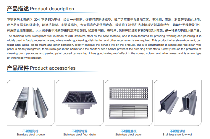 不锈钢防水墙是以 304 不锈钢为基材,经过一体压制、焊接打磨制造成型。被广泛应用于食品加工区,有冲刷、清洗、消毒等要求的场所。此产品在恶劣的环境中,能抵抗酸碱、血渍等腐蚀,大大提高产品使用寿命。现场施工简便和洁净墙板达到紧密结合,墙角处无缝隙及卫生死角防止滋生细菌。大大减少由于冲刷带来的洁净板鼓包、掉漆等问题。在转角、包柱等区域都有良好的防水效果,是一种新型的防水墙产品。